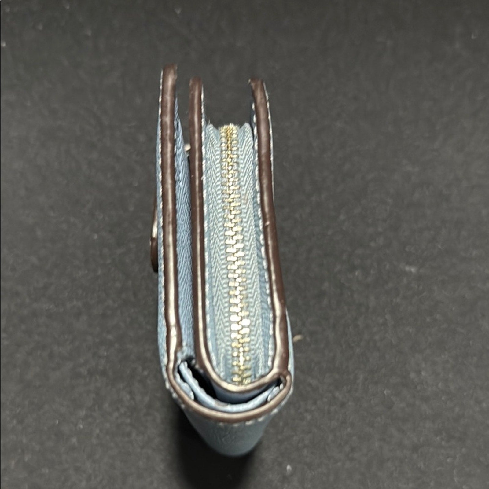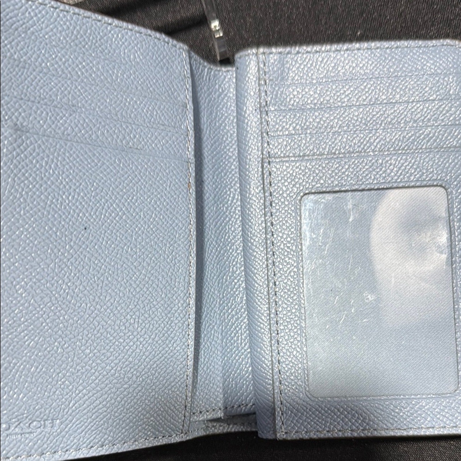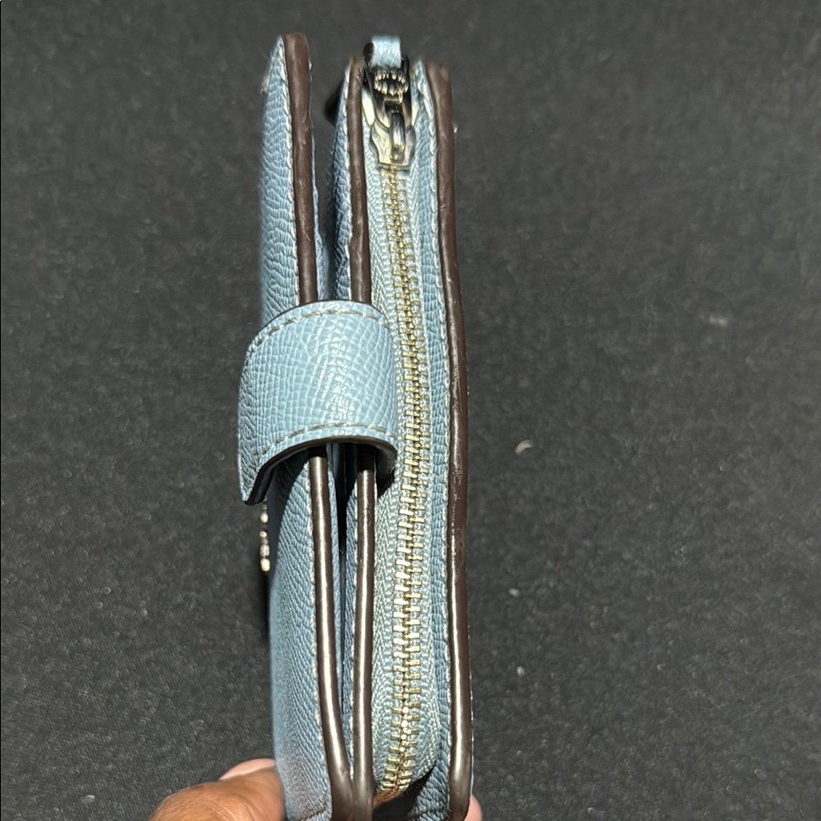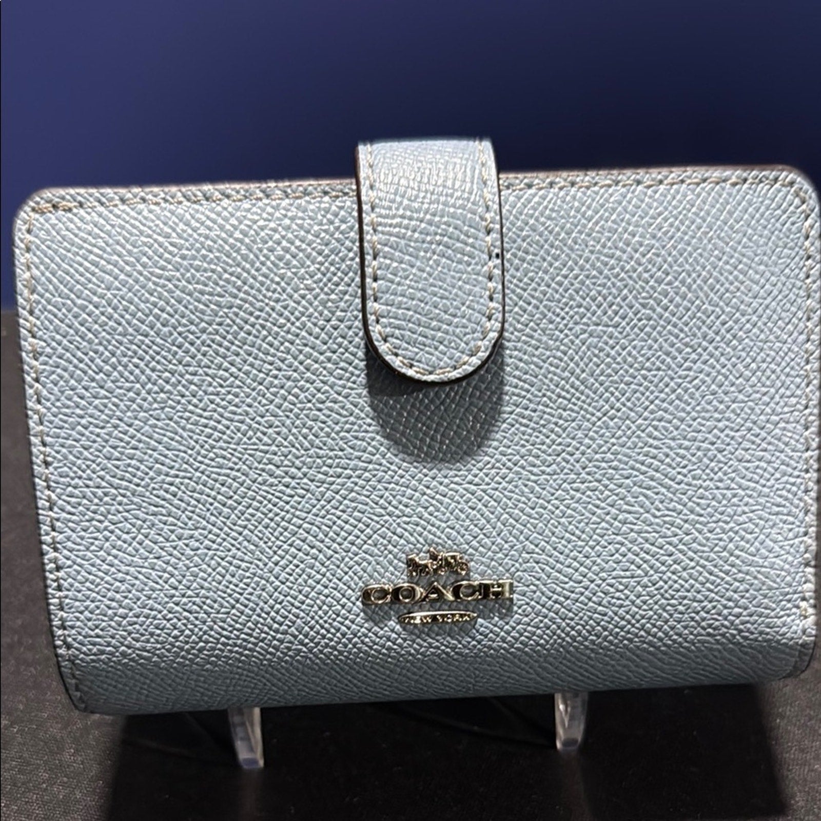 Chic Coach wallet in sky blue. Textured leather with a sleek snap closure.