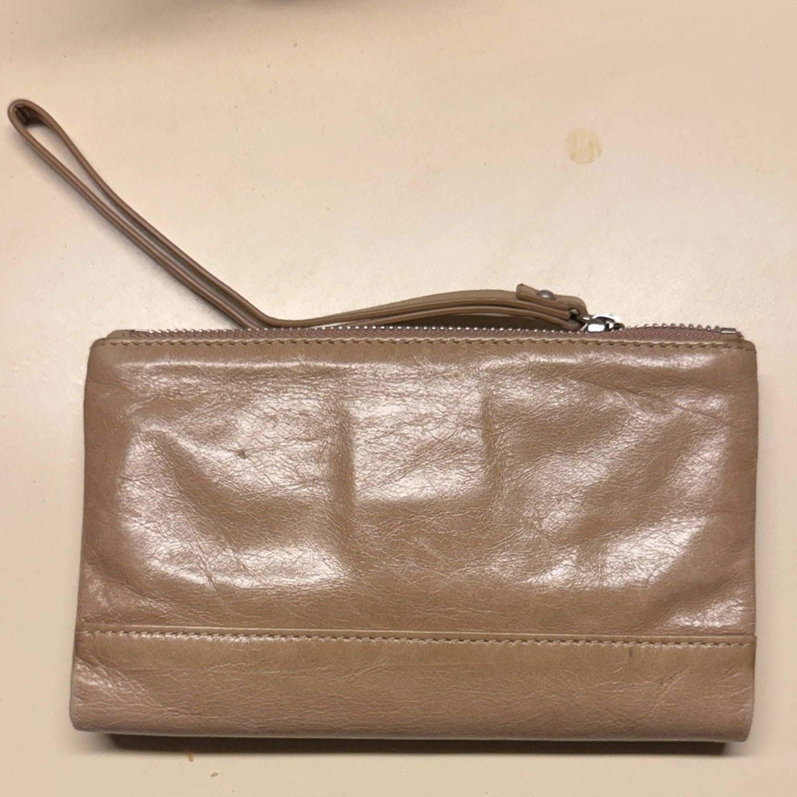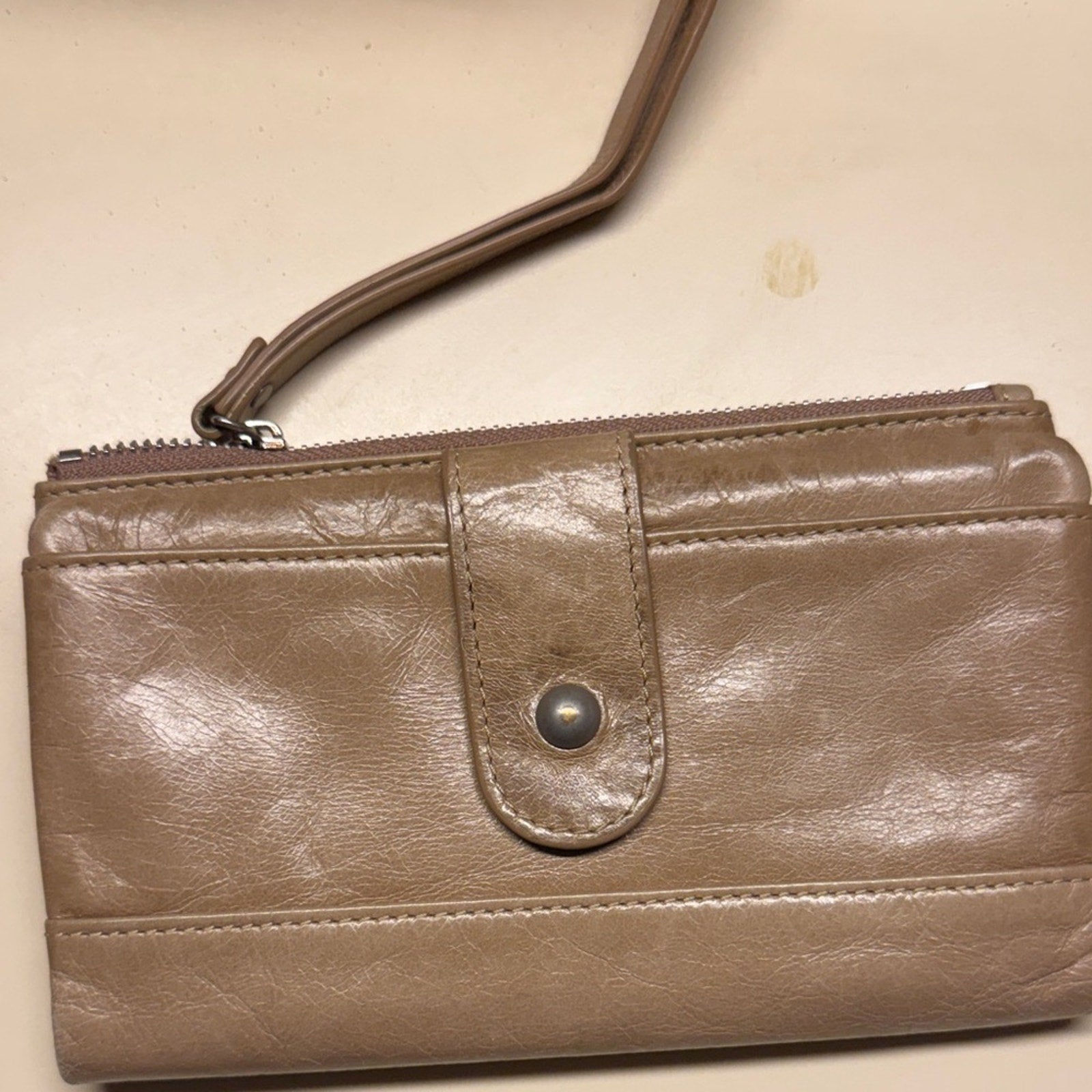 Fossil tan wallet. Measurements are: width is 7 1/2 inches, height when open is 7 inches and height when closed is 3 1/2 inches.